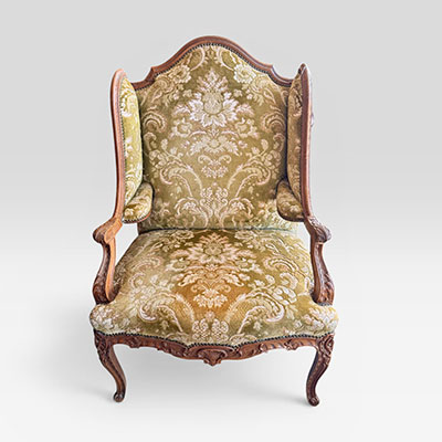 Early 20th century mahogany wing armchair upholstered in a pale lemon/green damask.
