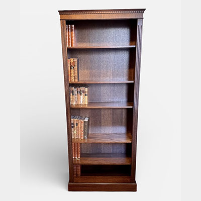 Mahogany open bookcase with adjustable shelves and dentil cornices.