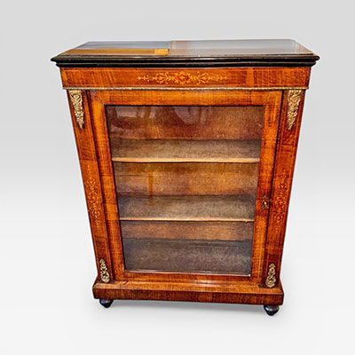 Victorian walnut and satinwood inlaid glazed bookcase with gilt metal mounts.