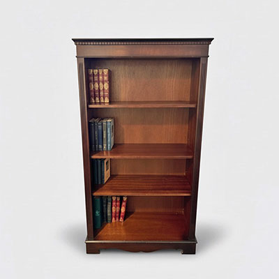 Tall and narrow mahogany open bookcase with adjustable shelves and dental cornice.