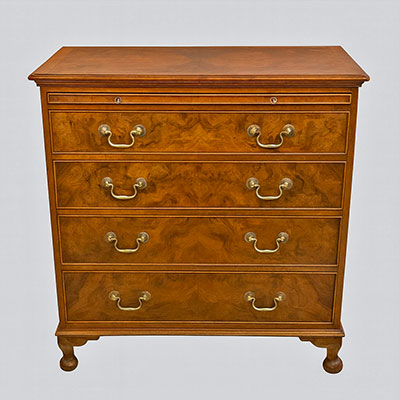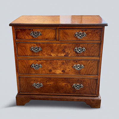 Small burr walnut chest of drawers with brass handles.