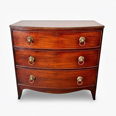 Small Regency mahogany bow front chest of drawers with lion mask ring handles.