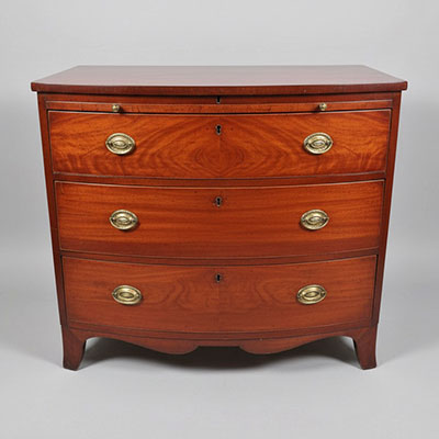 Fine quality Regency figured mahogany bow front chest of drawers with brass oval handles.