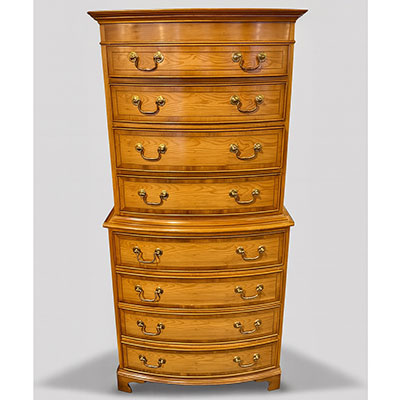 Small bow front yew-wood and crossbanded tall boy with brass handles.