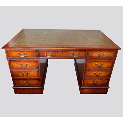 Large burr walnut pedestal desk with gilt tooled green leather top.