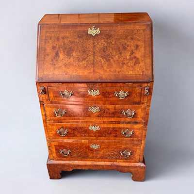 Small Queen Anne design figured walnut bureau with fitted interiors.