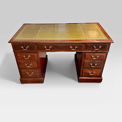 Victorian mahogany pedestal desk with green leather top and brass handles.