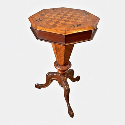 Victorian walnut and inlaid sewing table with chess top and on cabriole legs.