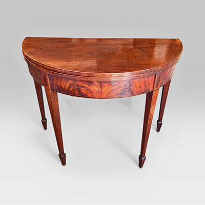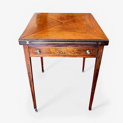 Edwardian mahogany and satinwood inlaid envelope top card table.