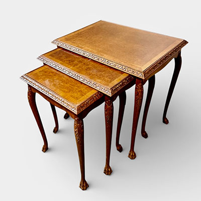 Small Edwardian mahogany and inlaid shaped tops nest of three tables with stretcher to base.