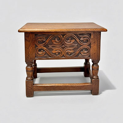 Nest of three oak tables with turned legs, carved front and sides and stretcher to base.