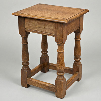 Small early 20th Century oak joint stool with turned legs and stretcher to base.