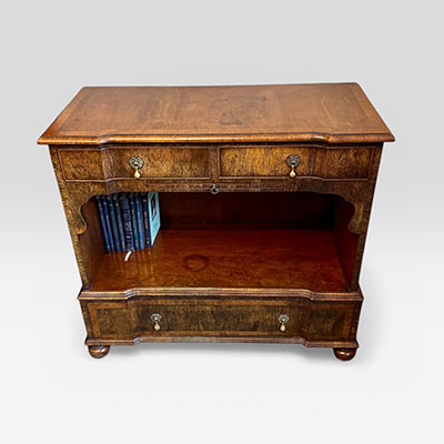Figured walnut and crossbanded bookcase with pull out slide and drawer.