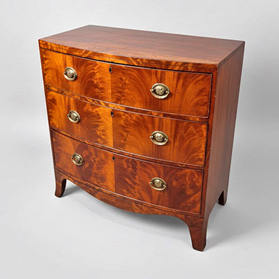 Small Regency mahogany bowfront chest of drawers with brass handles.