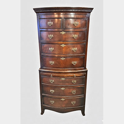 Small early 20th century mahogany bow front tall boy with brushing slide and oak drawer linings.