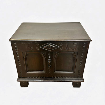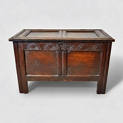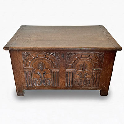 Small antique carved oak coffer with fleur-de-lis to the front and sides.